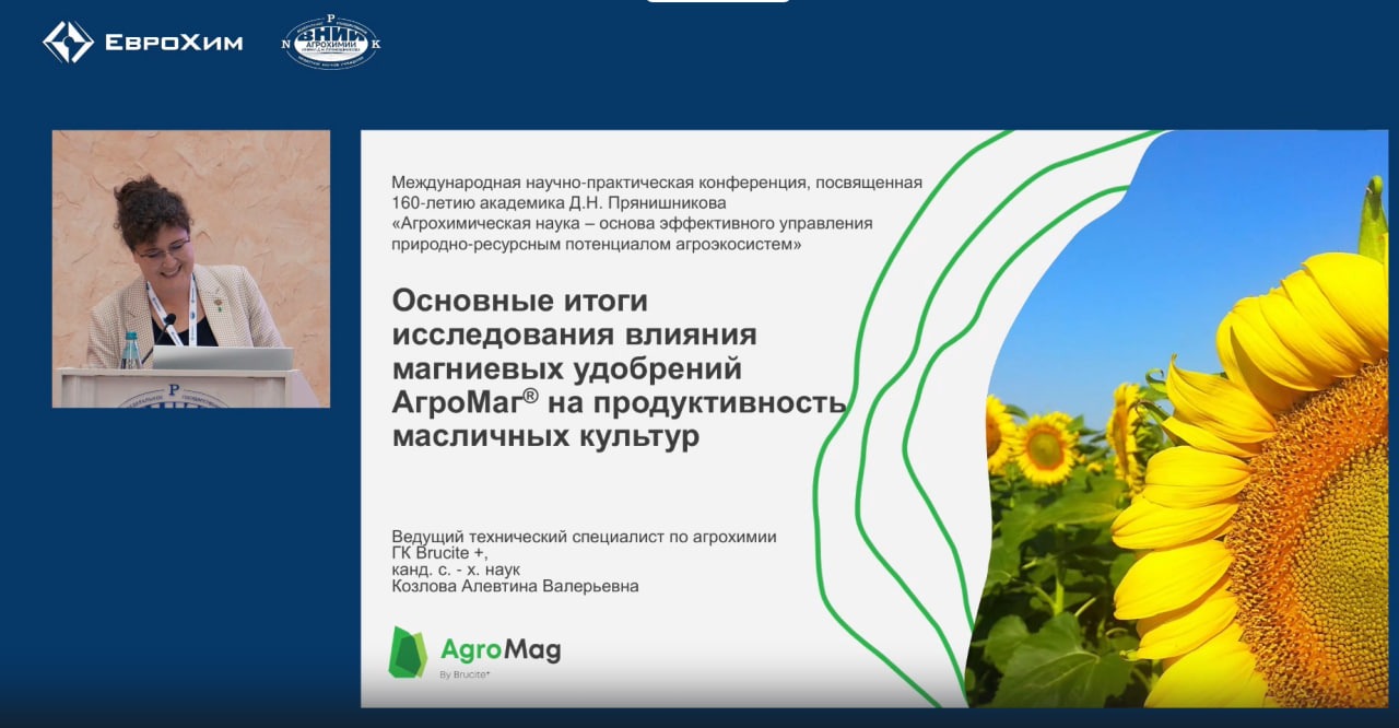 С докладом «Основные итоги исследования влияния магниевых удобрений Агромаг® на продуктивность масличных культур» выступил ведущий технический специалист по агрохимии Brucite+ , кандидат с.-х. наук Алевтина Козлова. Доклад был посвящен предложению варианта создания бездефицитного баланса магния в современном земледелии с помощью применения удобрений из природного минерала - брусита. Отдельное внимание было уделено проблеме дефицита магния во многих экономических регионах, что зачастую становится лимитирующим фактором получения стабильных урожаев надлежащего качества. Алевтина поделилась с аудиторией результатами целого ряда научно-исследовательских и производственных полевых опытов по применению линейки удобрений АгроМаг® на примере возделывания наиболее рентабельных на современном рынке масличных культур, а именно: сои, подсолнечника и рапса, в различных почвенно-климатических условиях. Широкомасштабные исследования ГК Brucite+ проводились совместно с ведущими отечественными научными институтами, ВУЗами и центрами агрохимслужбы.
