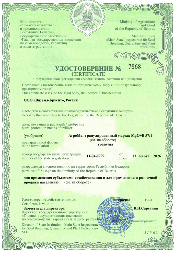 С гордостью сообщаем, что ООО "Вязьма-Брусит", являющееся частью промышленной группы компаний Brucite+, получило официальные регистрационные удостоверения на новые марки гранулированного удобрения АгроМаг® (марка с серой, марка с бором) в Республике Беларусь.